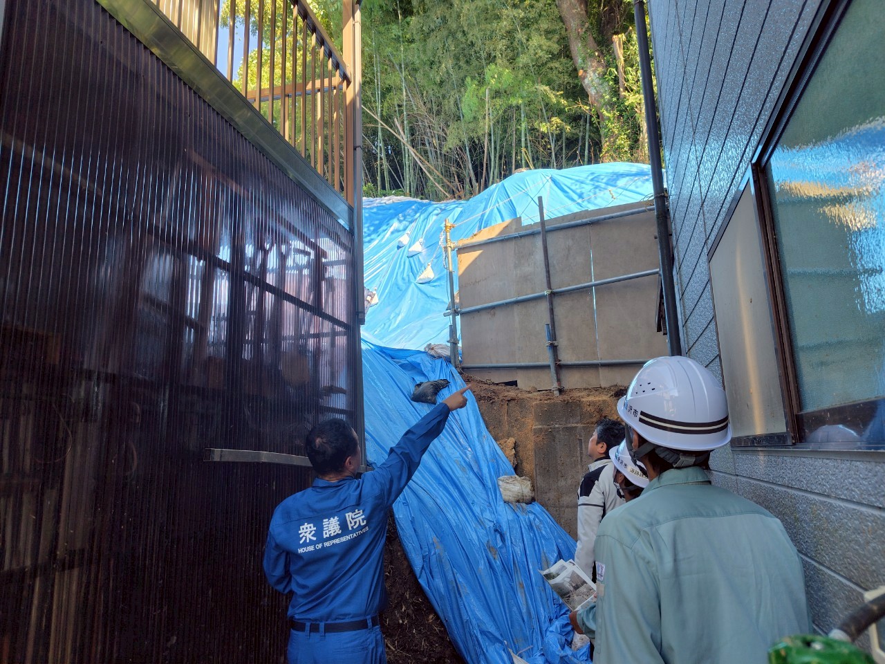 終了後、防災服に着替え、午後からは金沢市内の豪雨被災現場を訪問して、被害の状況を教えてもらいました。途中から、村山市長や金沢市役所の方々の視察に同行させてもらいました。
