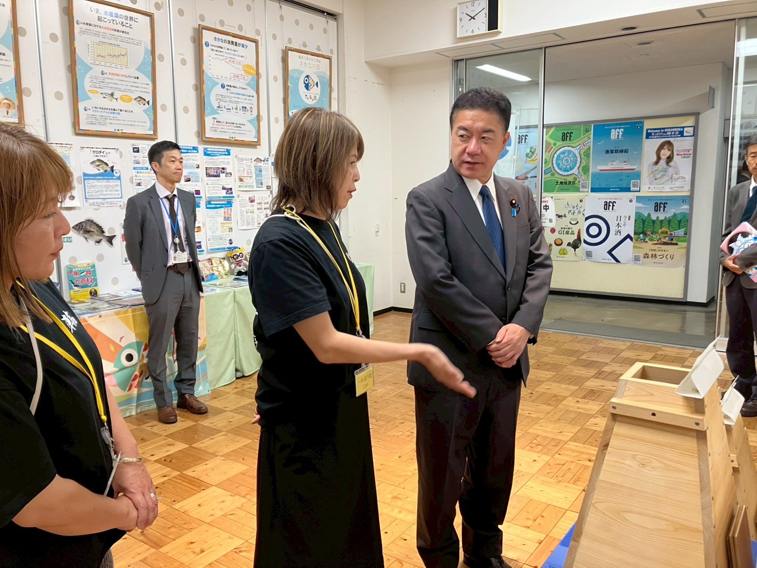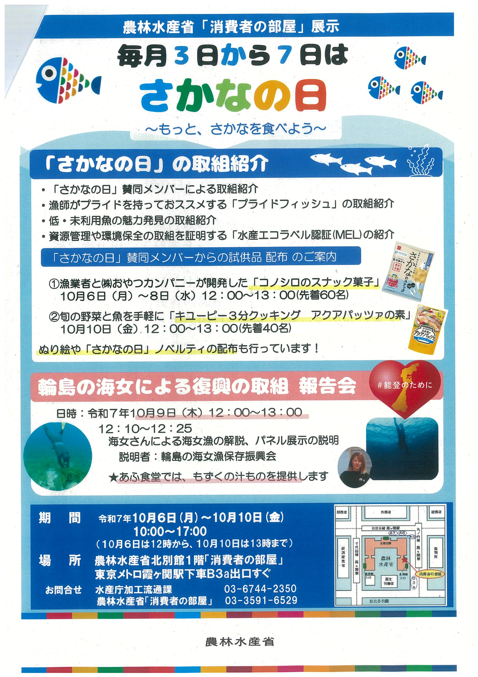 今回、「消費者の部屋」で「さかなの日」の取り組みを紹介する展示が行われ、その一環で輪島の海女さんによる復興の取組の報告会が行われました。